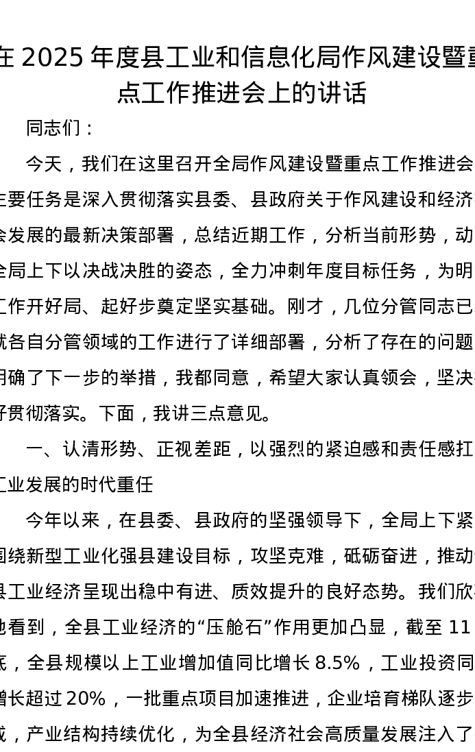 在2025年度县工业和信息化局作风建设暨重点工作推进会上的讲话