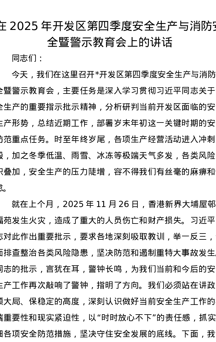 在2025年开发区第四季度安全生产与消防安全暨警示教育会上的讲话