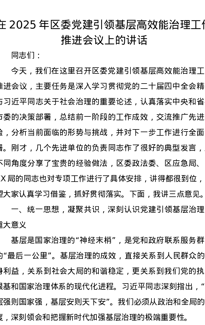 在2025年区委党建引领基层高效能治理工作推进会议上的讲话