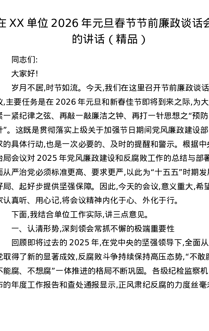 在XX单位2026年元旦春节节前廉政谈话会上的讲话