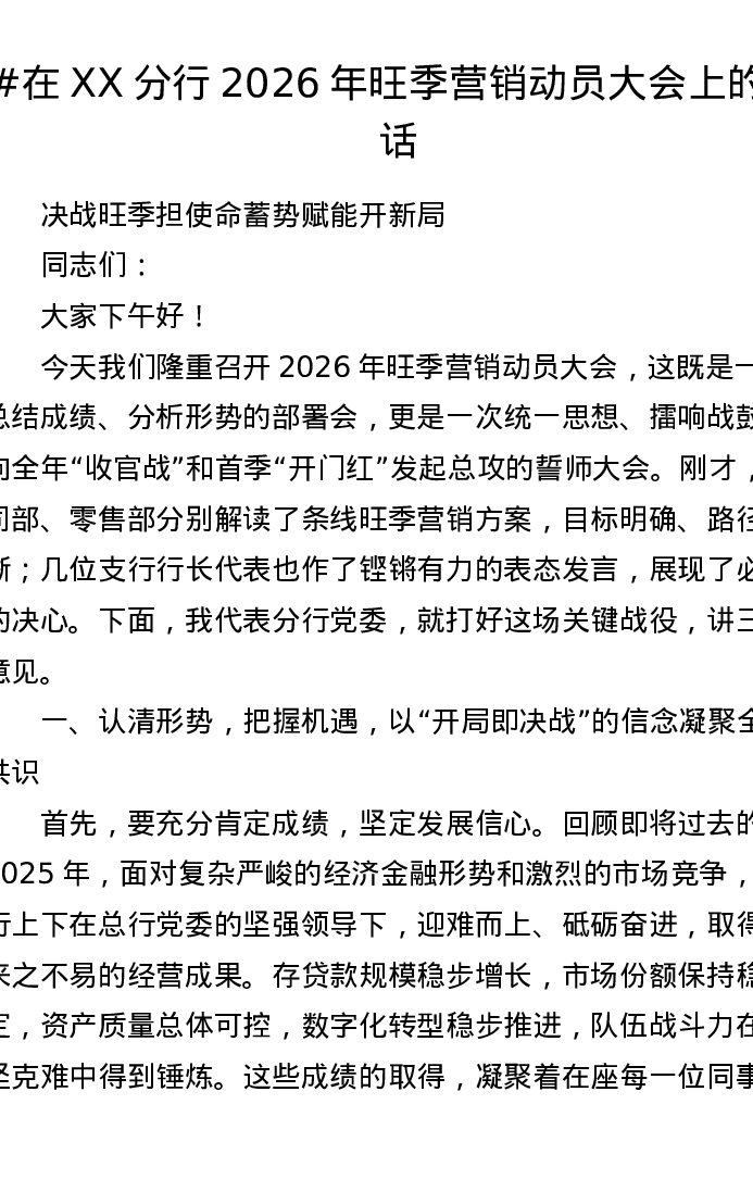 在XX分行2026年旺季营销动员大会上的讲话