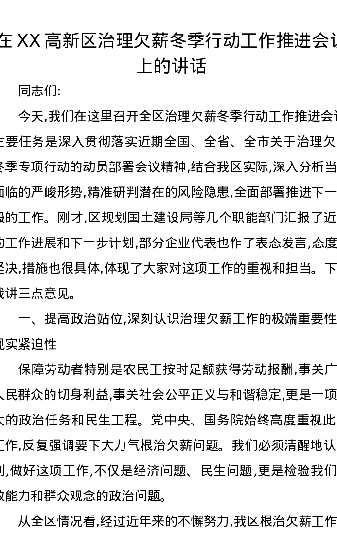 在XX高新区治理欠薪冬季行动工作推进会议上的讲话