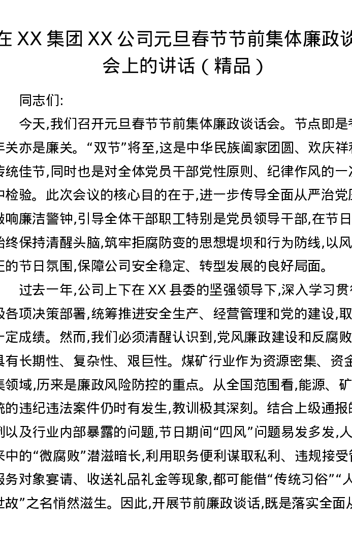 在XX集团XX公司元旦春节节前集体廉政谈话会上的讲话