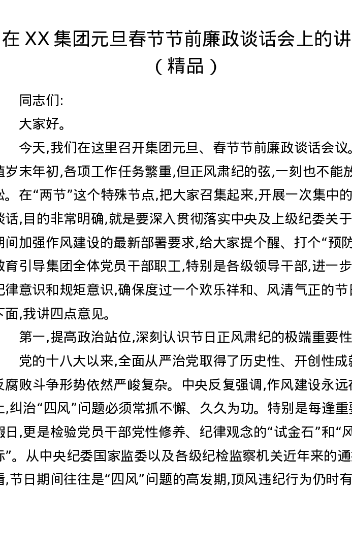 在XX集团元旦春节节前廉政谈话会上的讲话