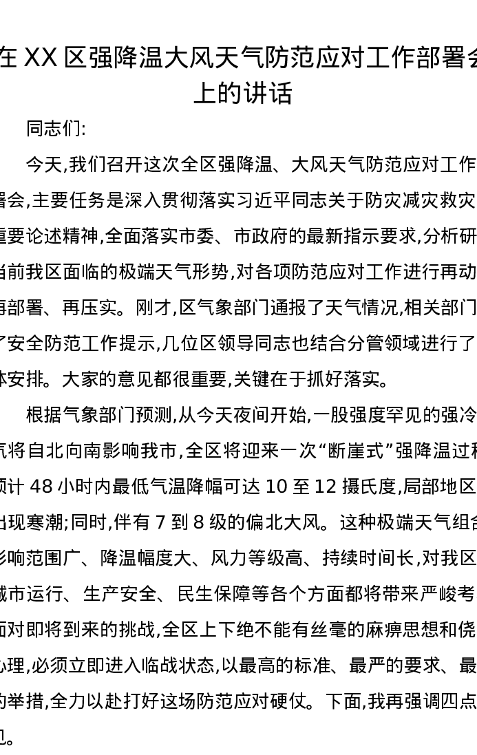 在XX区强降温大风天气防范应对工作部署会上的讲话2