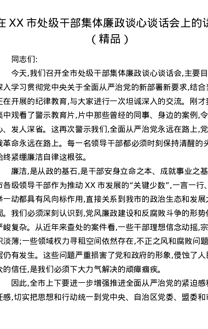 在XX市处级干部集体廉政谈心谈话会上的讲话