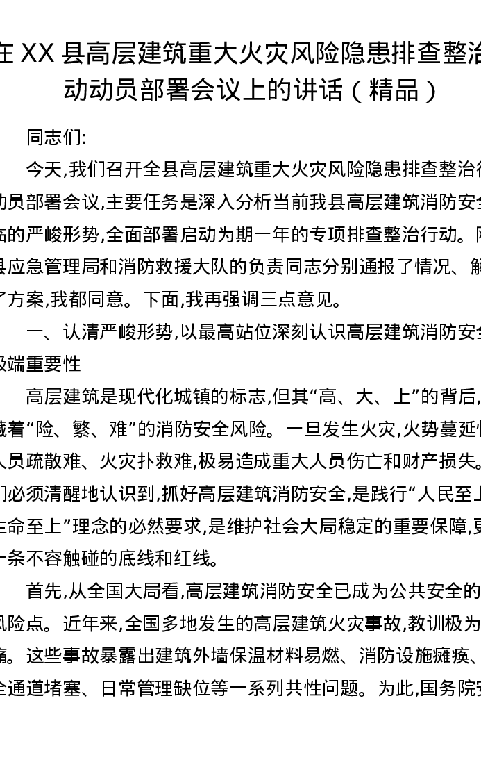 在XX县高层建筑重大火灾风险隐患排查整治行动动员部署会议上的讲话