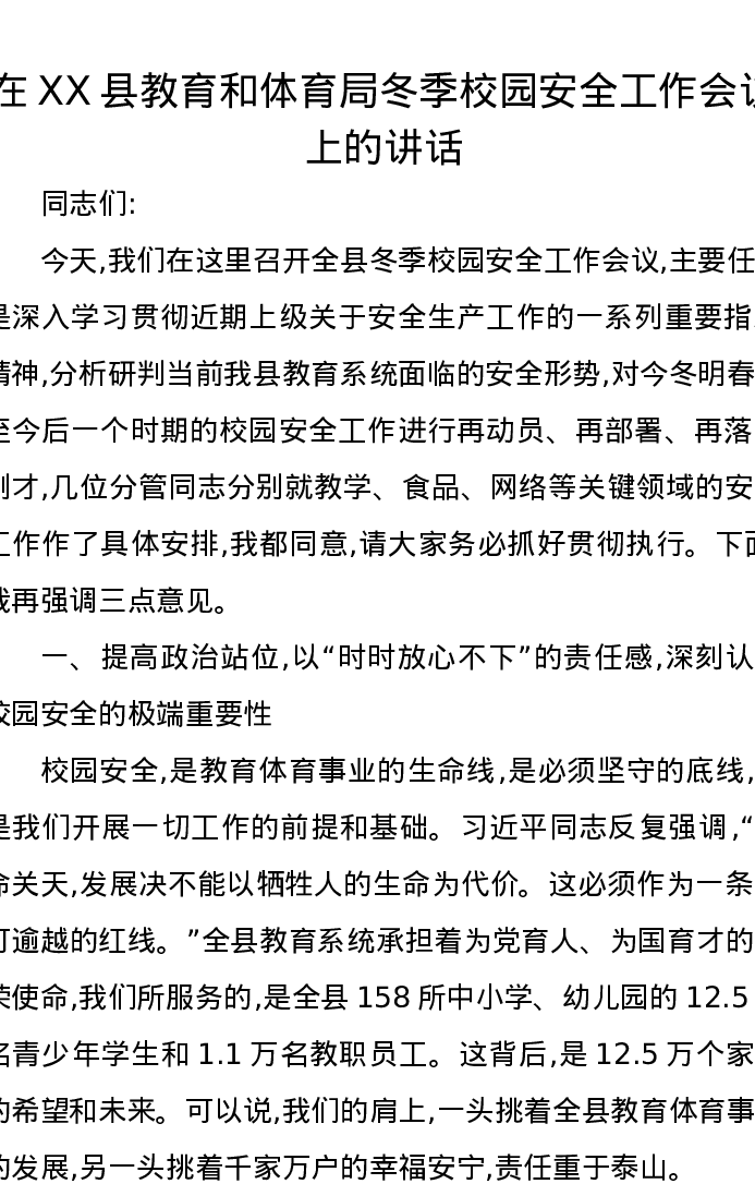 在XX县教育和体育局冬季校园安全工作会议上的讲话