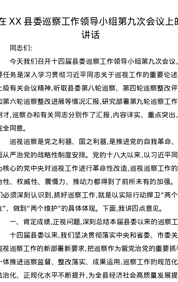 在XX县委巡察工作领导小组第九次会议上的讲话