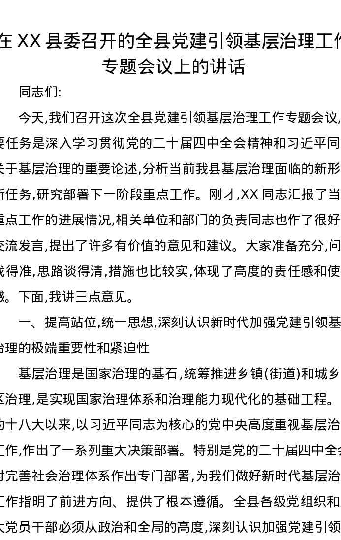 在XX县委召开的全县党建引领基层治理工作专题会议上的讲话