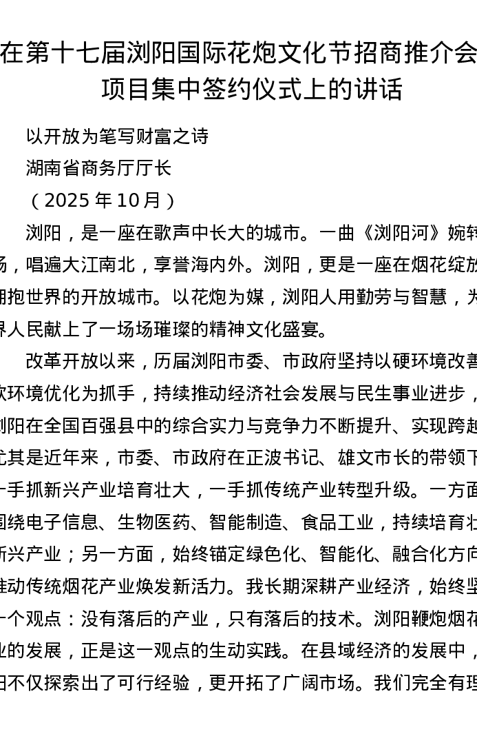在第十七届浏阳国际花炮文化节招商推介会暨项目集中签约仪式上的讲话