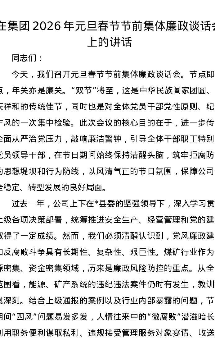 在集团2026年元旦春节节前集体廉政谈话会上的讲话