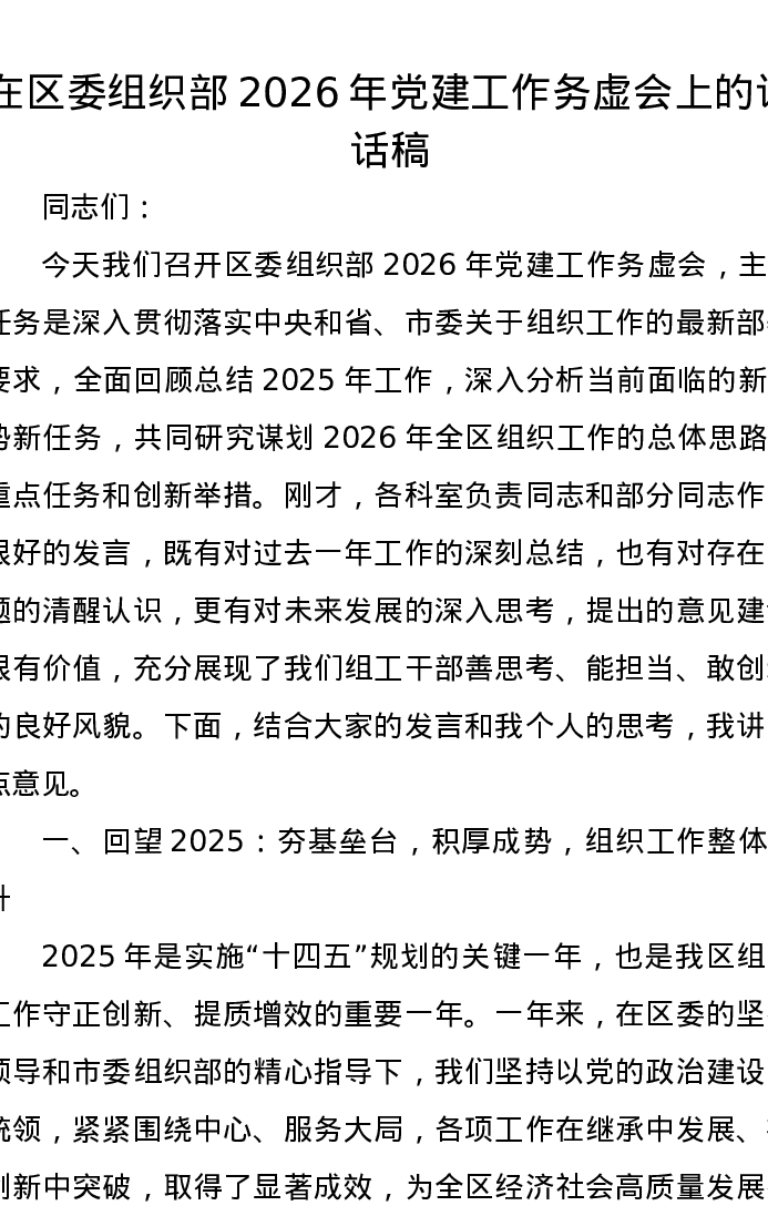 在区委组织部2026年党建工作务虚会上的讲话稿