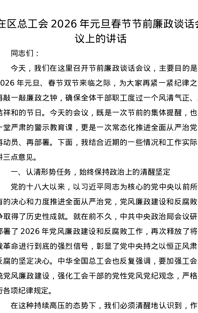 在区总工会2026年元旦春节节前廉政谈话会议上的讲话