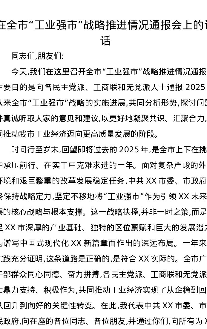 在全市工业强市战略推进情况通报会上的讲话