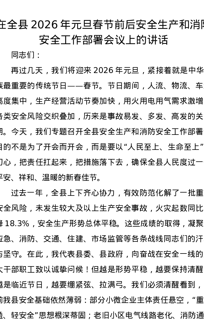 在全县2026年元旦春节前后安全生产和消防安全工作部署会议上的讲话
