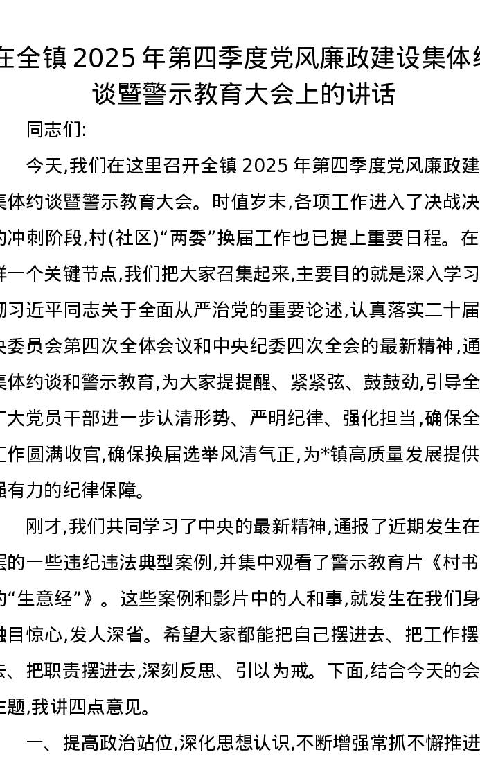 在全镇2025年第四季度党风廉政建设集体约谈暨警示教育大会上的讲话