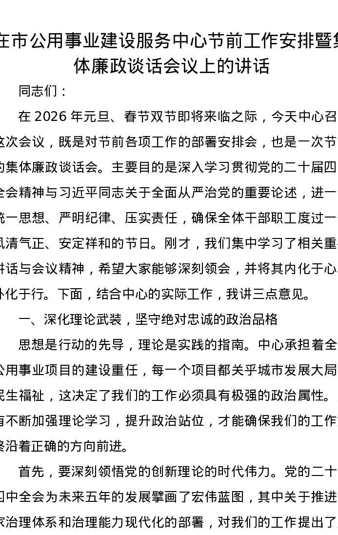 在市公用事业建设服务中心节前工作安排暨集体廉政谈话会议上的讲话