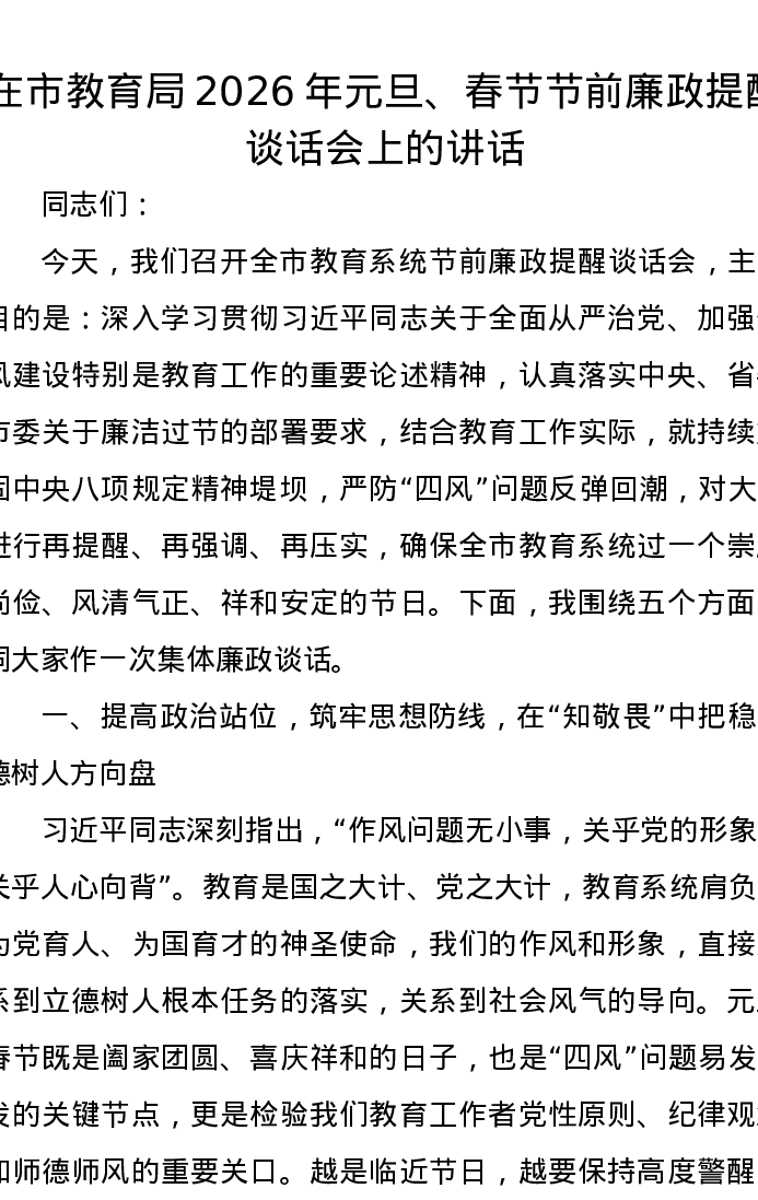 在市教育局2026年元旦、春节节前廉政提醒谈话会上的讲话