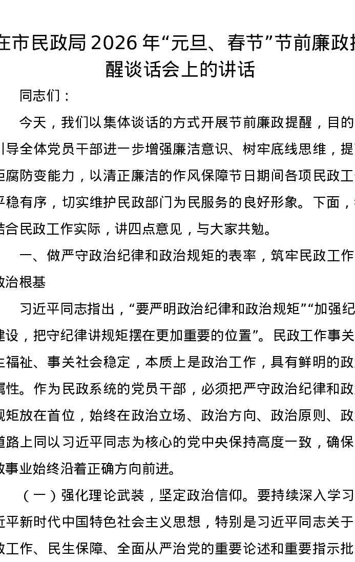 在市民政局2026年元旦、春节节前廉政提醒谈话会上的讲话