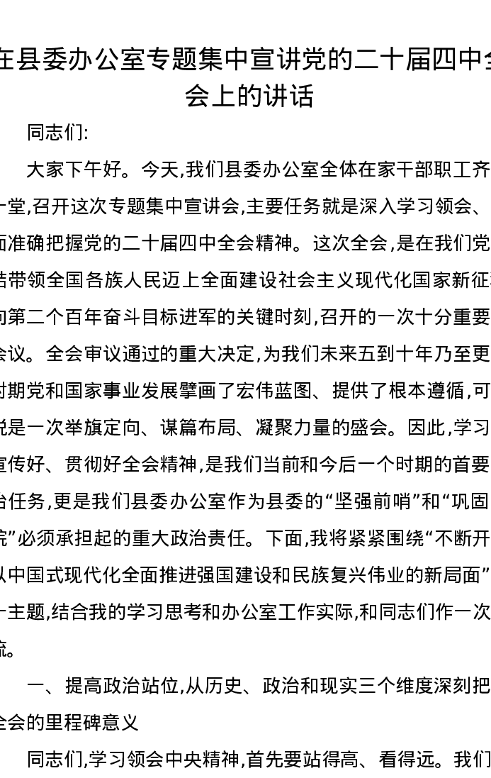 在县委办公室专题集中宣讲党的二十届四中全会上的讲话