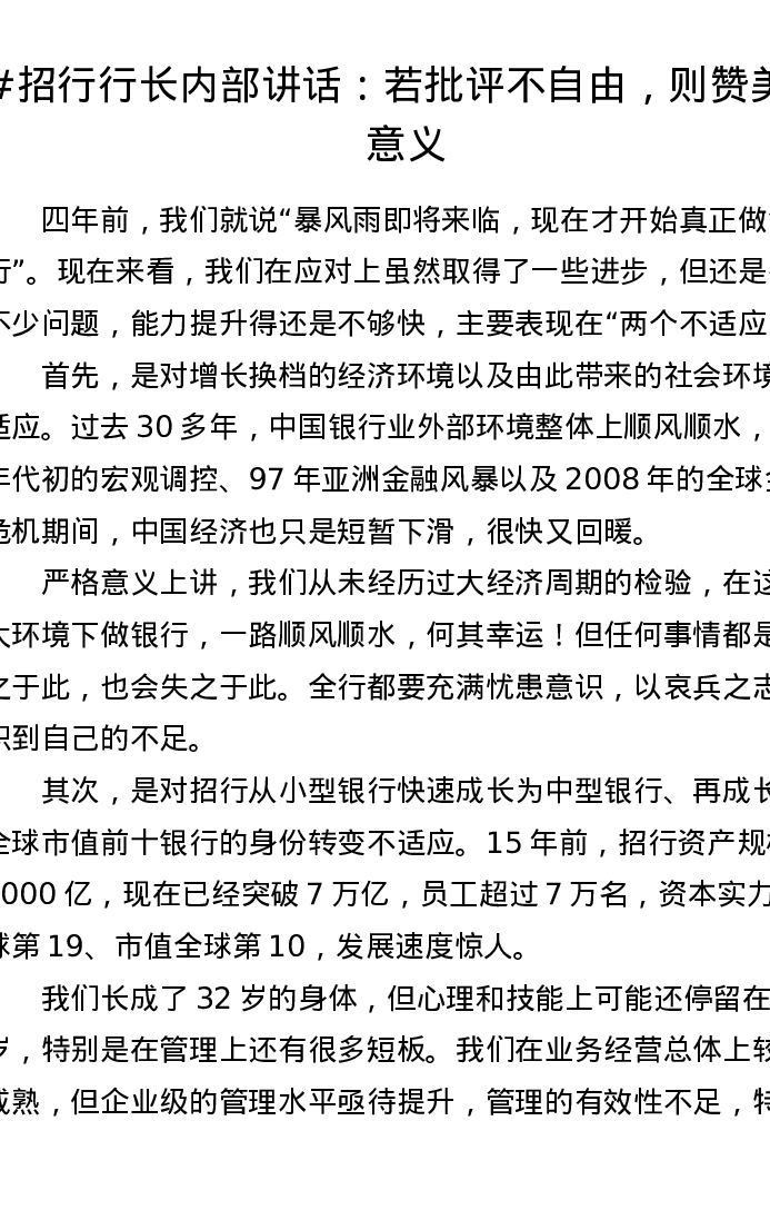 招行行长内部讲话:若批评不自由,则赞美无意义