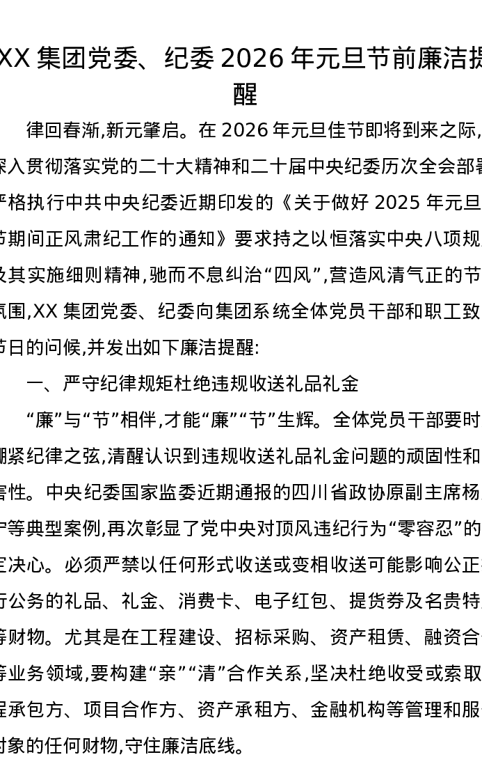 XX集团党委、纪委2026年元旦节前廉洁提醒