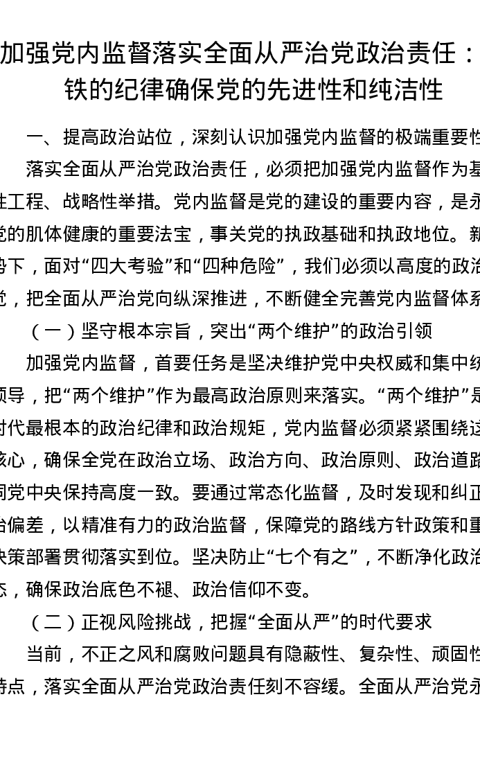 加强党内监督 落实全面从严治党政治责任:以铁的纪律确保党的先进性和纯洁性