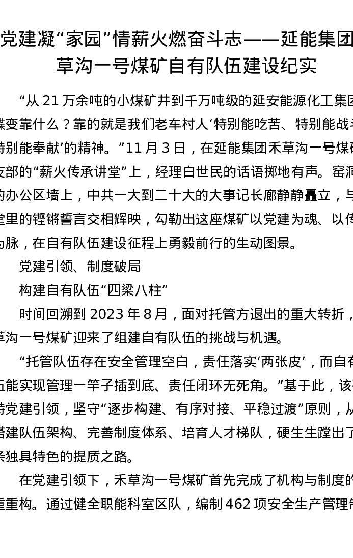 党建凝家园情 薪火燃奋斗志——延能集团禾草沟一号煤矿自有队伍建设纪实