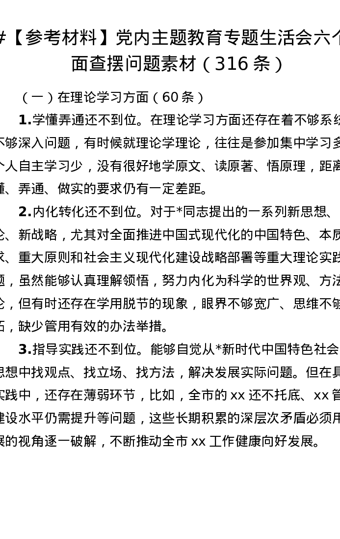 【参考材料】党内主题教育专题生活会六个方面查摆问题素材(316条)