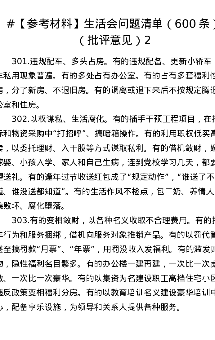 【参考材料】生活会问题清单(600条)(批评意见)2