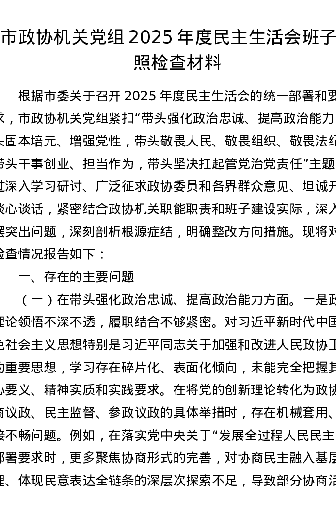 【原创】市政协机关党组2025年度xxxxx班子对照检查材料(7046字)