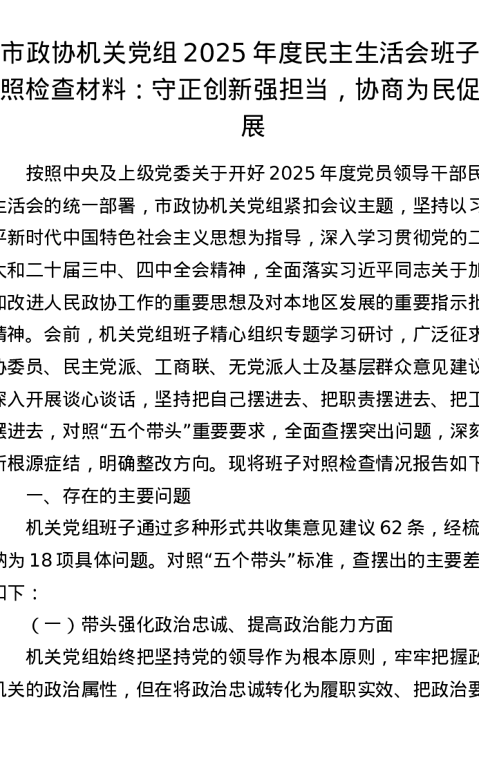【原创】市政协机关党组2025年度xxxxx班子对照检查材料:守正创新强担当,协商为民促发展