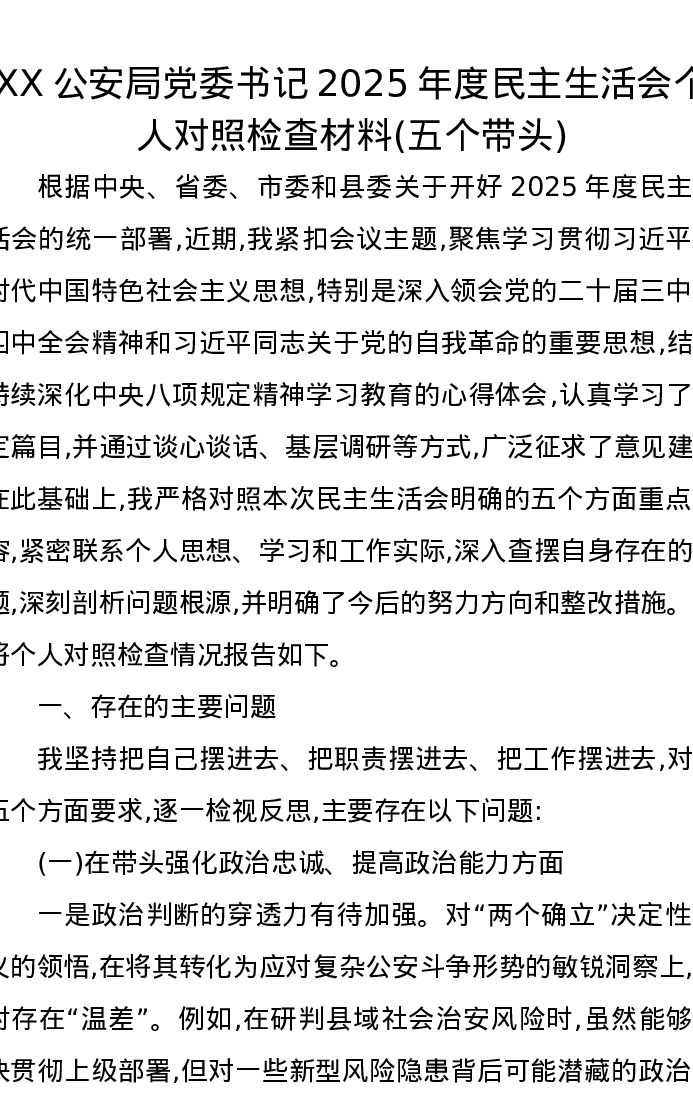 XX公安局党委书记2025年度xxxxx个人对照检查材料(五个带头)