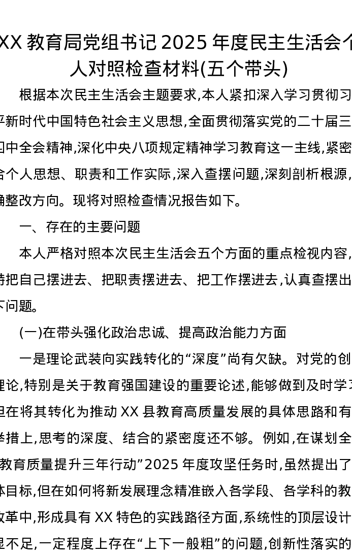 XX教育局党组书记2025年度xxxxx个人对照检查材料(五个带头)