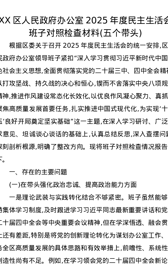 XX区人民政府办公室2025年度xxxxx班子对照检查材料(五个带头)
