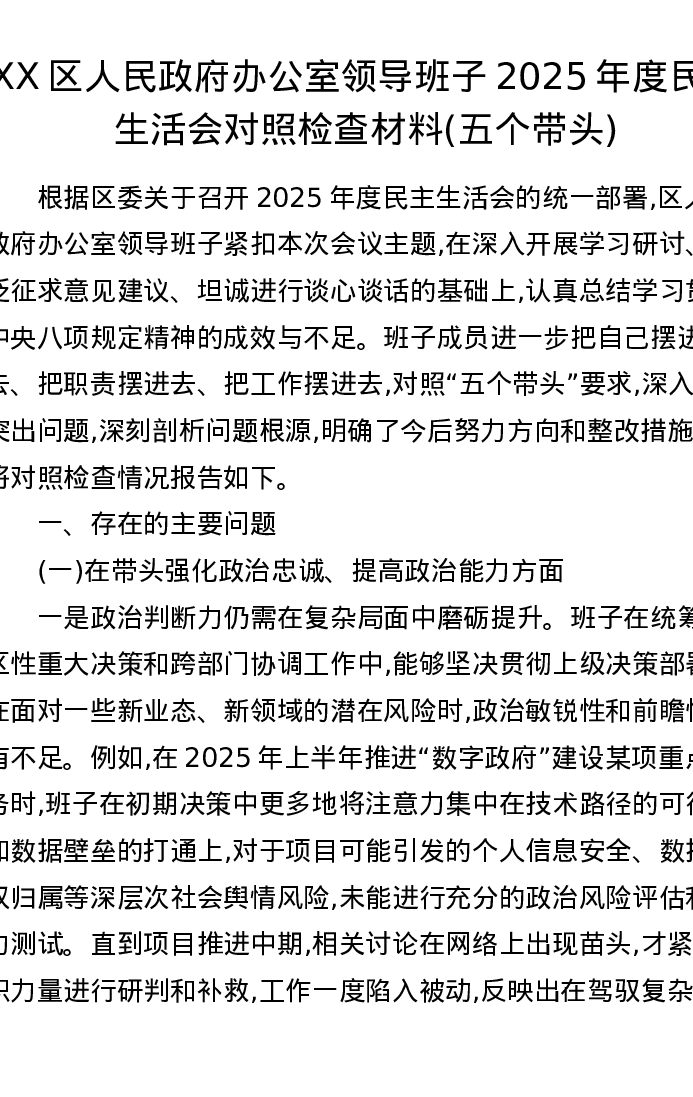 XX区人民政府办公室领导班子2025年度xxxxx对照检查材料(五个带头)(6161字)