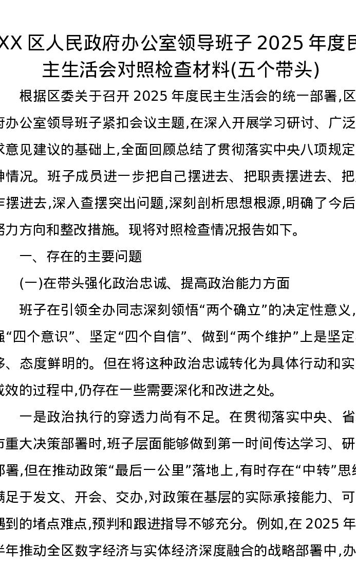 XX区人民政府办公室领导班子2025年度xxxxx对照检查材料(五个带头)