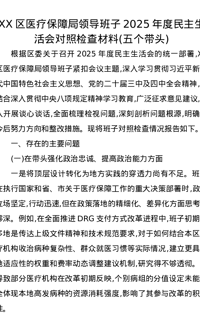 XX区医疗保障局领导班子2025年度xxxxx对照检查材料(五个带头)