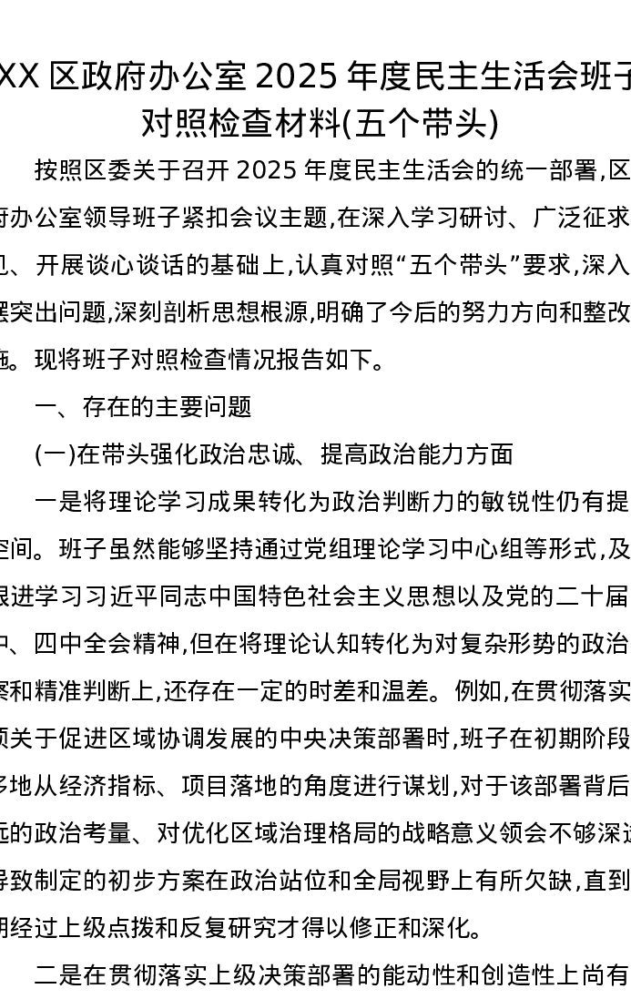 XX区政府办公室2025年度xxxxx班子对照检查材料(五个带头)