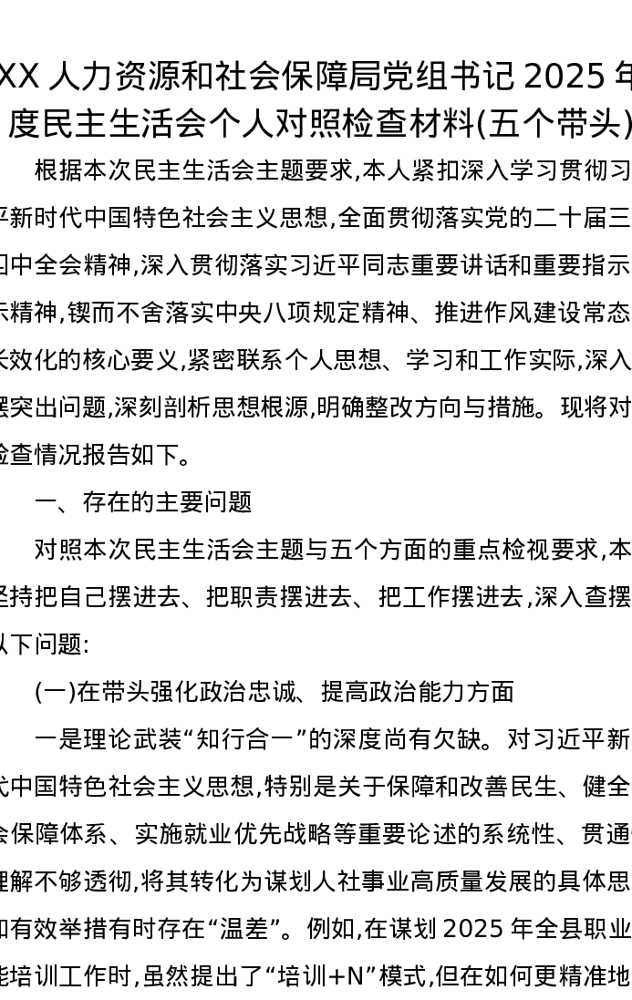 XX人力资源和社会保障局党组书记2025年度xxxxx个人对照检查材料(五个带头)