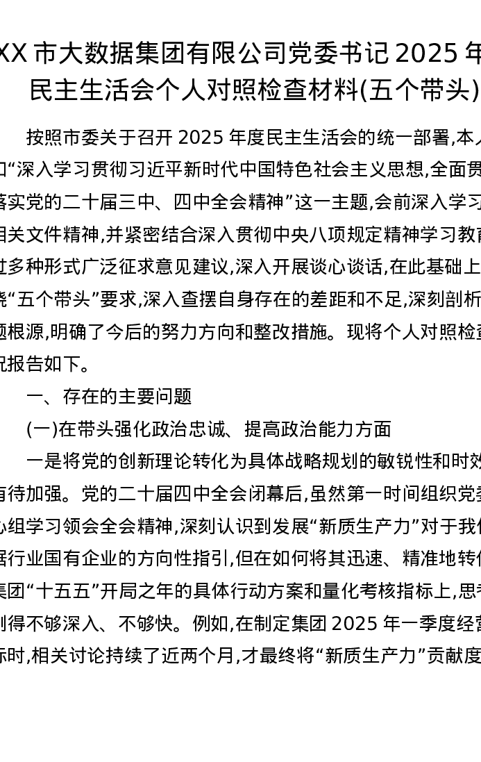 XX市大数据集团有限公司党委书记2025年度xxxxx个人对照检查材料(五个带头)