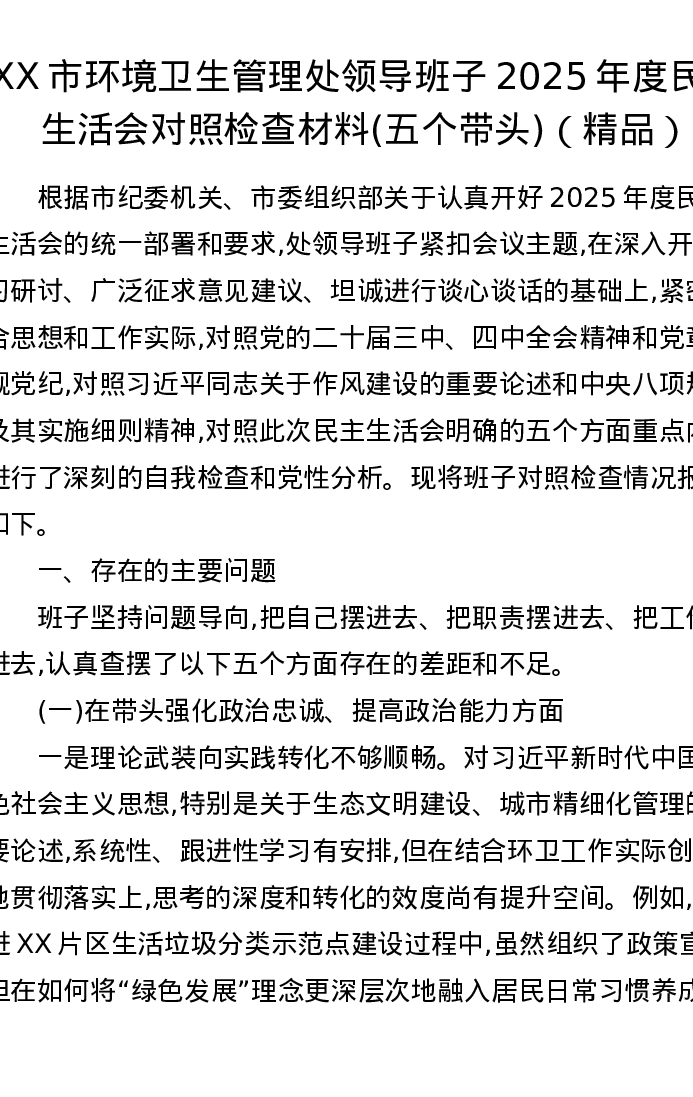 XX市环境卫生管理处领导班子2025年度xxxxx对照检查材料(五个带头)
