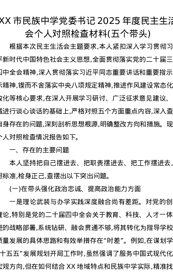 XX市民族中学党委书记2025年度xxxxx个人对照检查材料(五个带头)