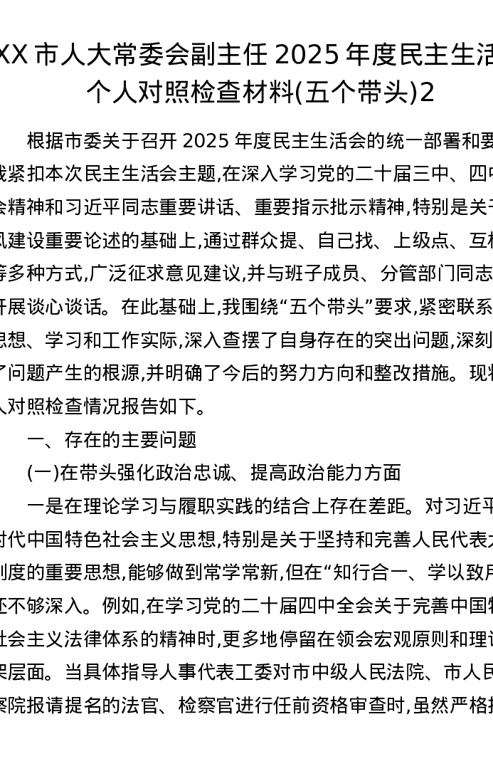 XX市人大常委会副主任2025年度xxxxx个人对照检查材料(五个带头)2
