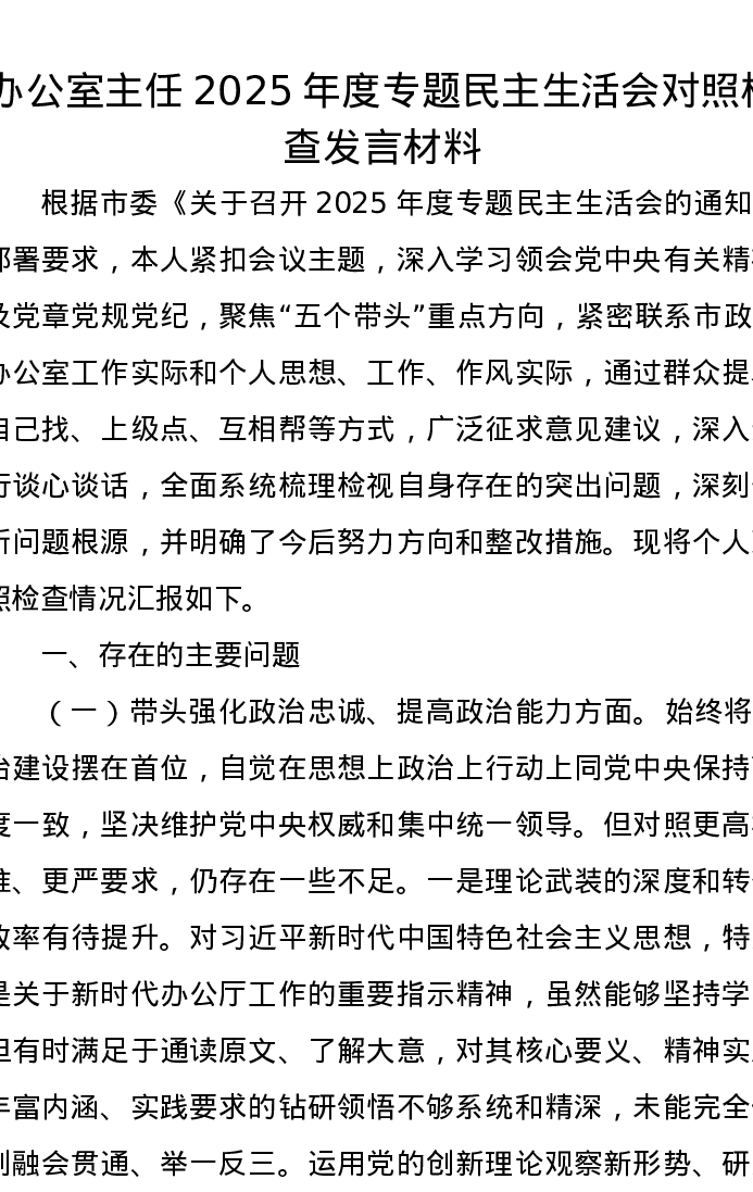 办公室主任2025年度专题xxxxx对照检查发言材料(五个带头)