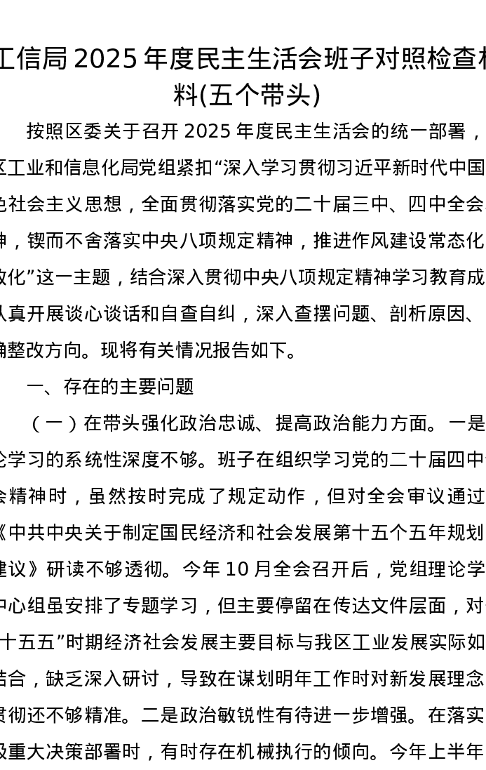 工信局2025年度xxxxx班子对照检查材料(五个带头)