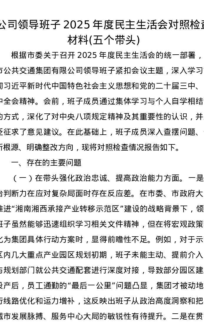 公司领导班子2025年度xxxxx对照检查材料(五个带头)