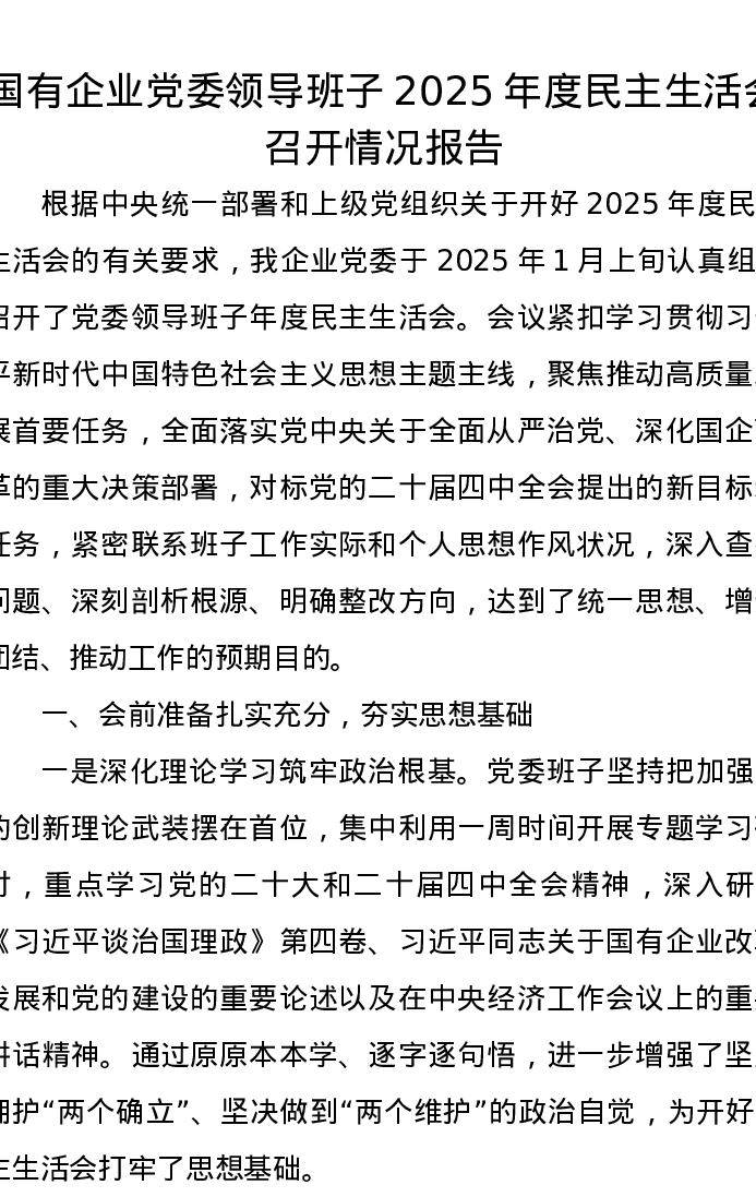 国有企业党委领导班子2025年度xxxxx召开情况报告(五个带头)