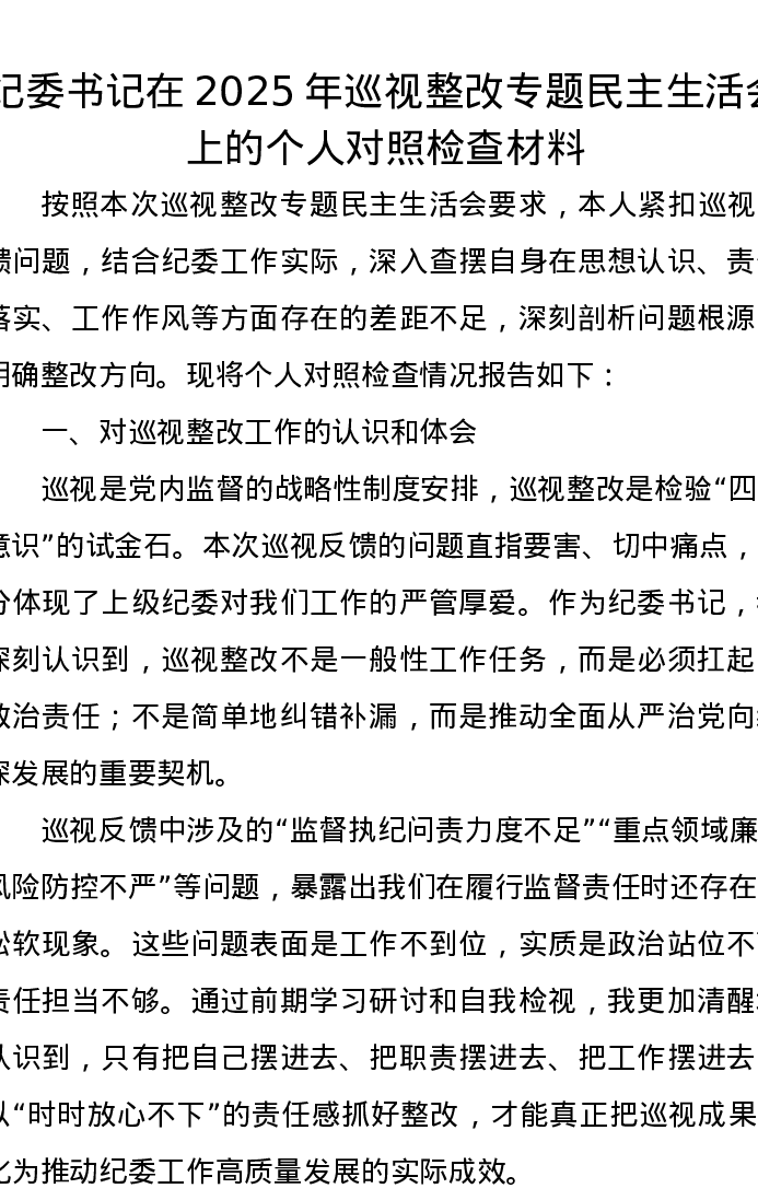 纪委书记在2025年巡视整改专题xxxxx上的个人对照检查材料